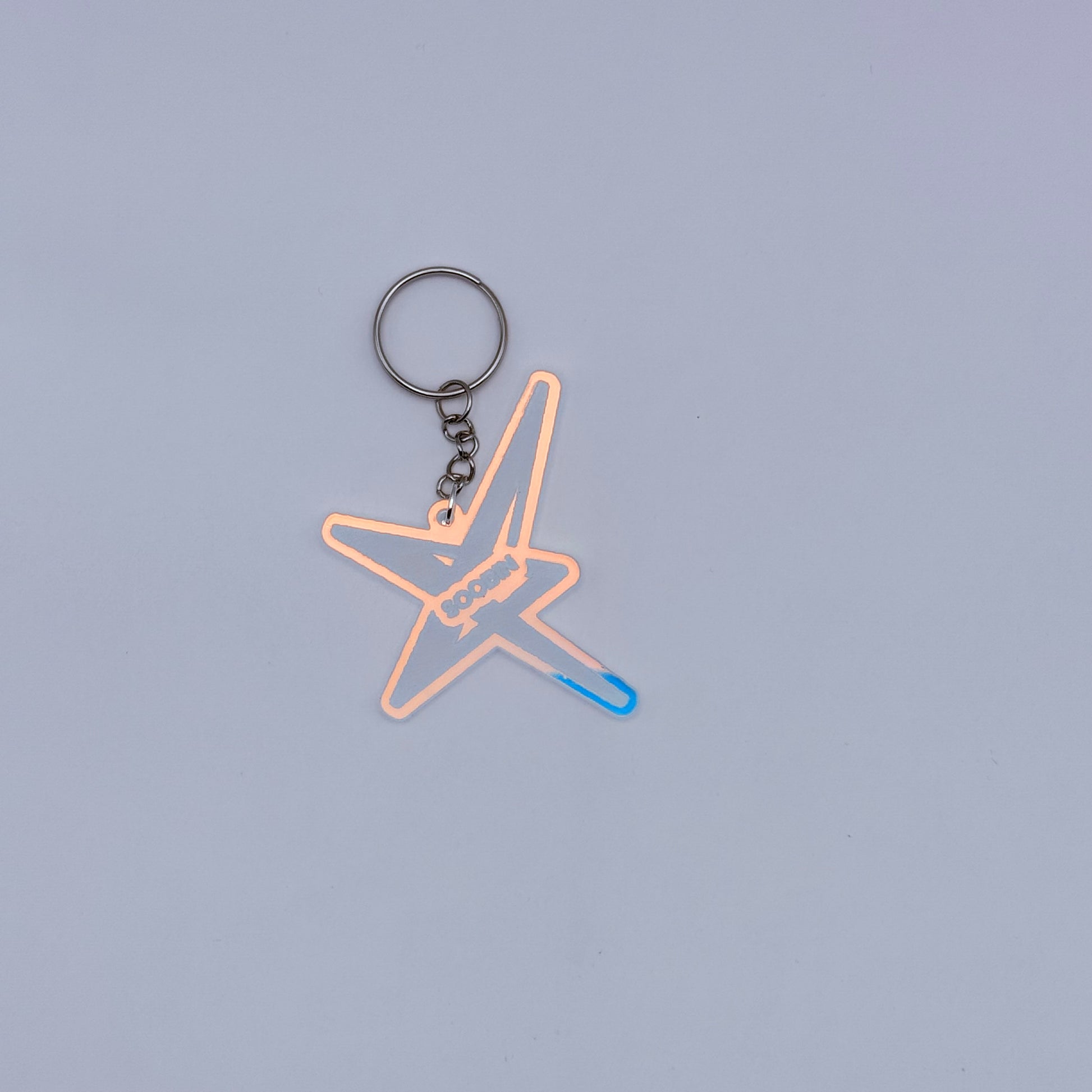 Approximate length of keychain is 2 in x 2.6 in (excluding the chain). Keychain is made up of 3mm iridescent transparent acrylic sheet. Please note that the color of the acrylic changes based off of the angle.